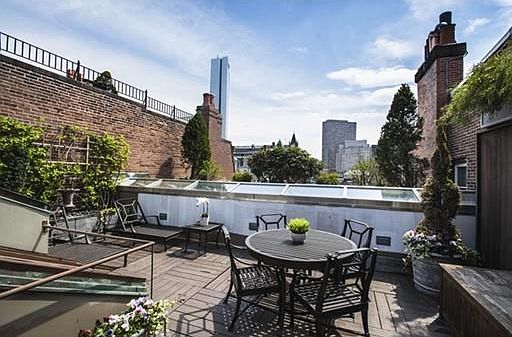 Rare penthouse opportunity in a pedigreed brownstone on Sunnyside Commonwealth Avenue. This 3-bed, 2-full bath duplex residence has been meticulously renovated and features direct elevator access into the expansive formal living and entertaining rooms. Spanning the full width of the building, the living room is highlighted by 16ft ceilings, intricate crown molding, carved fireplace and three large windows overlooking tree-lined Comm Ave. The sky-lit living room flows seamlessly into the formal dining room with the custom-designed Bulthaup kitchen just beyond. On the upper-level, the fireplaced family room steps out to the private landscaped roof deck with sensational views of Back Bay's skyline. The master suite features an oversized skylight, wall of custom closets, luxurious his & her baths with connecting walk-in shower, and three sets of French doors which open to a balcony. Deeded space- Public Alley #424, 128 Marlborough Space #2, Rented space- behind building 173 Comm Space #2