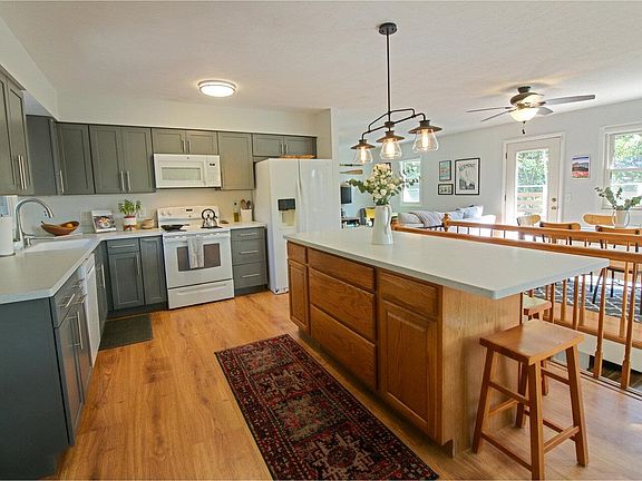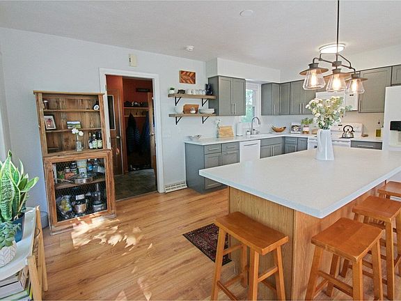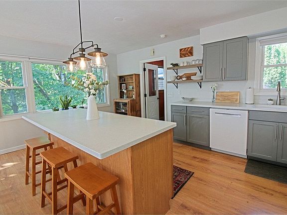 Unique and special location toward the end of a dead-end street, and tucked away on a private lot surrounded by mature trees with seasonal views of Camel's Hump! The floor plan is just as unique in this hillside ranch with finished walkout lower level. Upon entering, you are greeted by a must-have Vermont mudroom and the main living space offering an open floor plan with an abundance of south facing windows and sunlight. The remodeled kitchen has a large center island, perfect for gatherings, sleek modern cabinetry, solid surface counters, and more! Off the living and dining room is a glass door that leads to an expansive deck for relaxing or entertaining. Two bedrooms and a full bath round out this level. Head downstairs to find a family room with woodstove, rec room with custom built-in wet bar, plus a two-room primary bedroom suite with plenty of closet space and primary bath with double vanity. You'll also find a storage/workshop space with laundry. In addition, this lower level boasts plenty of windows for natural light and a glass slider leading to the private backyard. The 2-car garage comes in handy for storage or winter parking, and beautiful perennial landscaping surrounds the home. Winooski schools and sports fields are a stone's throw away, and with many amenities and I-89 nearby as well, you'll enjoy easy living from this property!
