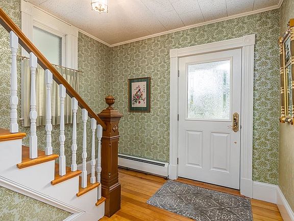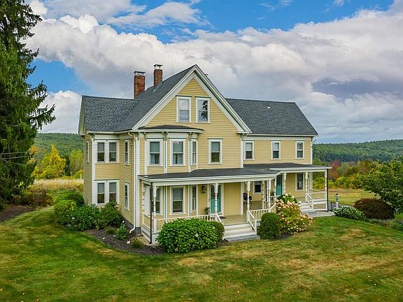 This beautiful Victorian Farmhouse built in 1899 has been thoughtfully renovated and maintained to retain its charm. This extraordinary home offers lots of natural light and scenic views from many of the rooms, curved walls, pocket doors and other period details. The maple floors have been refinished and run throughout most of the home. The main floor features an eat in kitchen with pantry, large dining room, living room, den with fireplace, family room/parlor, a separate home office with custom bookshelves and a full bath. The handsome staircase leads to the 2nd floor with a generous center hall, a master suite with sitting room and large master bath, 3 additional bedrooms, and a walk up attic with potential for additional living area or storage. The land is just as beautiful with views of Hycrest pond, 7 acres with possibilities for horses, chickens or walking trails. Recent updates include the roof, heating system including 2 oil tanks, and septic system. Schedule your showing today