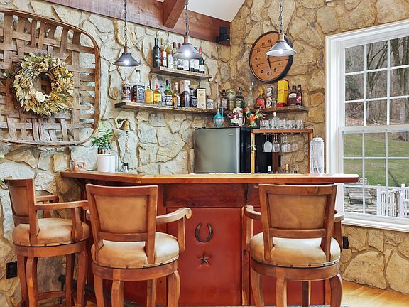 Welcome to your dream escape! This gorgeous private retreat, set on almost 60 sprawling acres, is just a short 10-minute drive from downtown Lynchburg. The brick and stone exterior exudes timeless elegance, while the grand living space inside features a stacked stone fireplace, soaring ceilings with exposed beams, and abundant natural light. A built-in rustic home bar adds charm, making this space perfect for entertaining. The spacious kitchen is a chef’s delight with two islands and wood cabinetry. Enjoy meals in the eat-in dining area or cozy up in the breakfast nook below bay windows. The sunroom is a standout feature, offering a place to enjoy year-round. The main-level primary suite boasts a sizeable walk-in closet and an en-suite bathroom complete with double sinks, a separate makeup vanity, and a tiled shower. An office on the main level adds convenience, while upstairs you’ll find two bedrooms and two bathrooms for added comfort. The partially finished basement offers a second kitchen, opening the door to endless possibilities for additional living space. Outdoor living shines with a hot tub, raised garden beds, an outdoor kitchen, and a fire pit. A detached workshop/apartment with a full bathroom provides even more versatility, whether for guests or hobbies, or additional income potential.