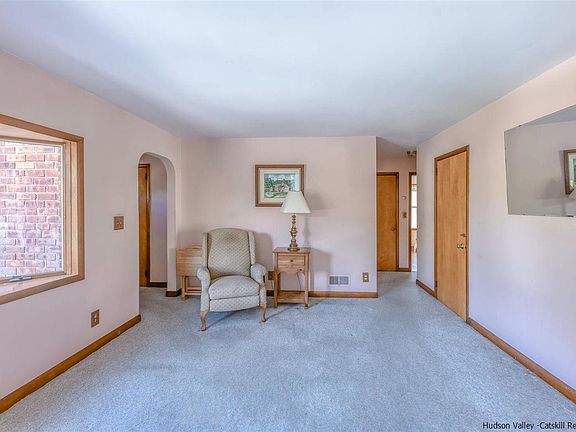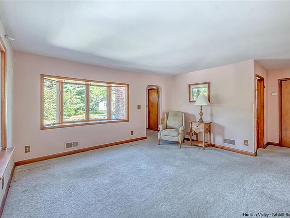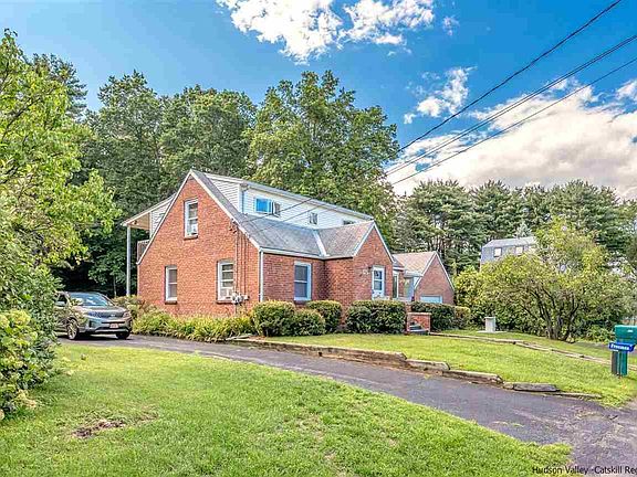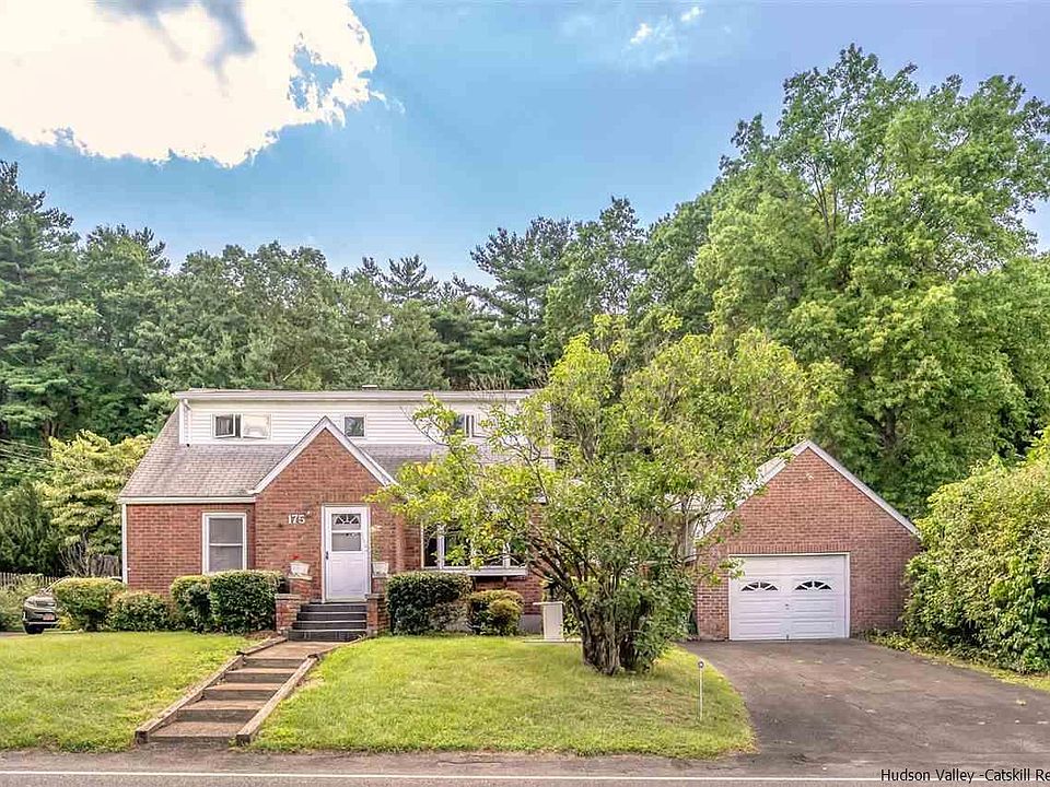 This Mid Century Brick Cape is situated on an acre of beautifully landscaped property with a gorgeous yard accented with a perennial garden and Rose of Sharon as a back drop. A good portion of this property also goes into the back woods. This home offers flexibility as a single family, a legal 2-family or an in law apartment upstairs. Any of these would work without changes to this home. The custom kitchen has maple cabinets with tons of storage including an appliance garage. The double sink with a large sliding window looks out onto that awesome backyard. There is an attached garage with a garden/workshop room too! The living room has a large bay window that gives this home wonderful natural light and there are also white oak floors running under the carpet and into the bedrooms. The second level has a master bedroom suite, family room and private deck. This home is minutes to Kingston, Saugerties and Woodstock each with walkable streets to restaurants and shops. So convenient to everything!! Only 90 minutes from NYC at Exit 19 on the NYS Thruway.
