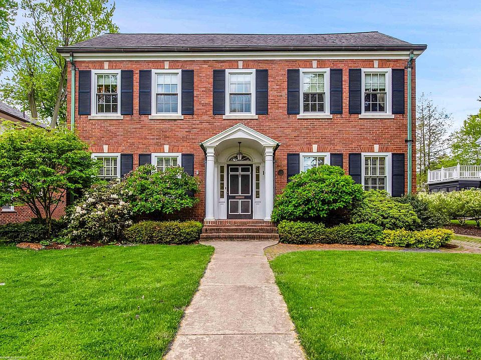 Impressive Georgian Colonial designed by Architect Louis Kamper. This home features beautiful original workmanship throughout, a grand entry with a regal black & white harlequin floor; large great room w/ a natural fireplace; formal dining room, ideal home for family living, entertaining and a home office. 9’ high ceiling, handsome paneled wood walls and a natural fireplace, pegged wood flooring & a coffered ceiling in the den, updated gourmet kitchen with a functional eat-in island, lots of light & fresh updated oak floors, custom shutters throughout, spacious primary ensuite with an updated private bath and walk-in-closet, upstairs laundry room, Pella windows, H/E tankless water heater, updated HVAC, finished basement with a gas fireplace, workout room, gift wrapping room and office. Spectacular perennial gardens with a custom mosaic tile patio. Bonus pizza oven/outdoor kitchen area perfect for entertaining family & friends. This home is truly a must see masterpiece! 1 year home warranty at close.