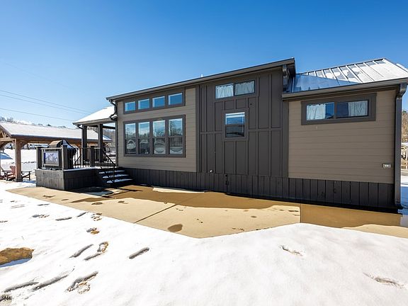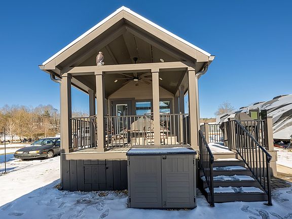 Wake up to peaceful pond views and unwind in a thoughtfully designed tiny home retreat in the sought-after Waterside at Blue Ridge community. This stylish and cozy getaway blends modern comforts with rustic charm, offering the perfect escape in the North Georgia mountains. Inside, hardwood floors flow throughout the space, complemented by cozy fireplace for those chilly days and evenings. The family room's vaulted ceilings and extra space add to the appeal of this property. The beautifully appointed kitchen features quartz counters, stainless steel appliances, and a charming coffee nook—ideal for slow mornings with your favorite brew. The spacious bedroom provides a large closet and extra storage, while the loft has additional space for guests or relaxation. Step outside to take in the stunning pond views from your custom-built pavilion with a fireplace, perfect for year-round enjoyment. The custom railing and unique artwork add a personal touch to the exterior, making this home truly one of a kind. Located in a resort-style community with a pool, clubhouse, stocked ponds, a dog park, and more, this home is perfect as a full-time residence, vacation retreat, or income-generating rental. Don't miss your chance to own this one-of-a-kind pondside tiny home in North Georgia! Schedule your showing today
