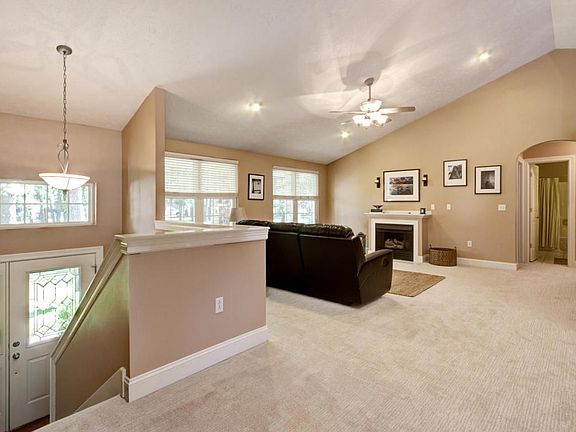 What a lovely cul-de-sac of gorgeous well-groomed homes! This home features views and a walk-out basement, plus stylish color choices. Move-in with fresh paint and all new carpet. You will appreciate the level of maintenance and clean living! The master is split from the other bdrms & is spacious with an upscale shower, jetted tub, dual vanities, generous linen storage, his and her closets. Kitchen, living and dining are connected with an large opening over the sink so the cook can be part of the party! Views out the back and the deck/patio are of a private, wooded oasis-acreage that isn't a chore to maintain! The basement boasts a large living & rec room, walks out to the patio, 3-car garage with shop sink, laundry/mud room, 3rd bath & a very large bedroom. So much to love here!