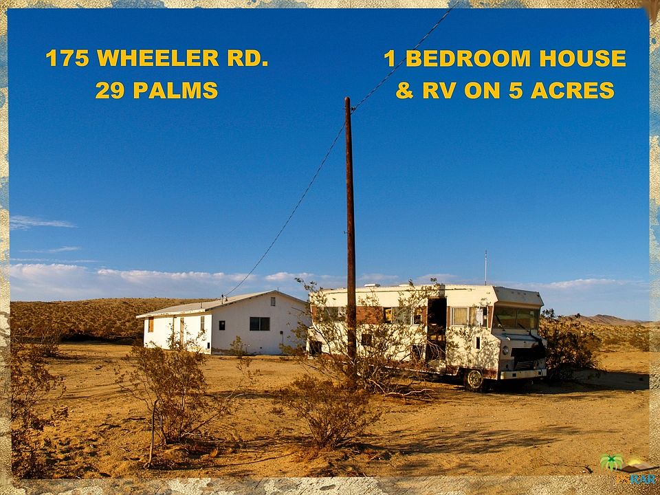 175 WHEELER RD, TWENTYNINE PALMS $69,000.00 - Very secluded 1 Bedroom/1Bath house on 5 acres. Size 832 sq. ft per tax records. Covered Patio in back yard. This home is located on the north end of 29 Palms next to the Marine Base. No neighbors are close, this home is at the end of the road all by its lonesome. Has electric meter. Located on the property is an Old RV that would be fixed up for your guest house. Old water well appears to be on the property that needs repair. Home needs some TLC to be the awesome home it could be. Perfect for rancho home bring your horses, dogs & ducks. Lot Dimensions 331 X 663. Surrounded by government land on 3 sides. Owner will carry loan with 20% down $ a 1st Trust Deed of $55,200.00 at 7% interest amortized over 7 years payable $1093.03 per month + $15.00 monthly loan service fee. APN#0633-341-10-0000DIRECTIONS: Take Morongo Rd until it dead ends at the marine base entrance then go left on Brandt Crossing Rd go down about a mile and tu