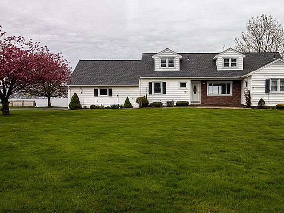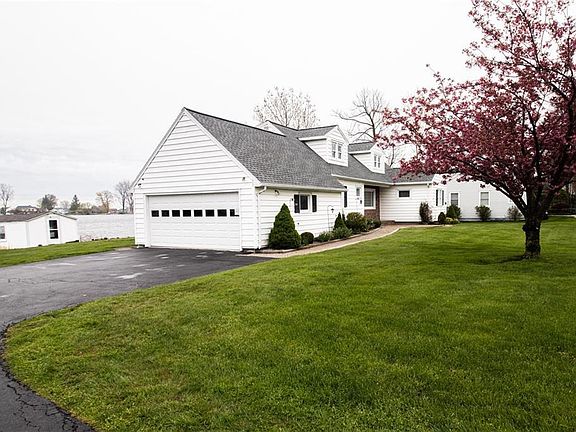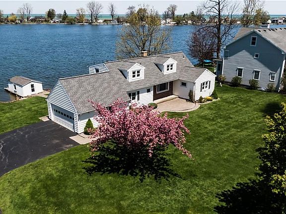 150 ft of water frontage on Cranberry Pond (RARE double lot!!)!1st floor features TWO bedrooms, large living room with wood burning fireplace and picture window facing the water. Water views from almost every room! 1st floor laundry. Full bath on each level. Utility room and powder room 1st floor. Hardwoods under every carpeted room! Eat-in kitchen features oak cabinetry. Large bonus room upstairs can be used as a 5th bedroom or a family room/ office. Attic storage closets. Whole house generator! Central air. All appliances included. Outside features beautiful brick paver walkway. 2 car attached garage with overhead storage rafters. Boat house! Home needs a little updating/elbow-grease but the possibilities are great here!! Great waterfront location on Cranberry Pond-- well know for its water skiing and fishing! Many boat launch access points nearby. Braddock's Bay Marina just up the street! Easy access to Parkway and commutes! Very affordable waterfront home-- vacation year-round! RARE FIND on WATERFRONT!