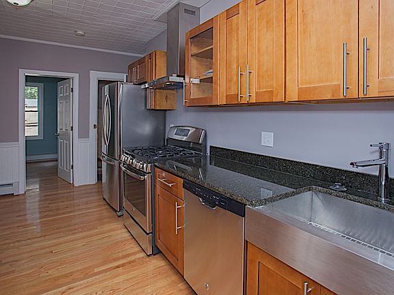 Modern eat-in kitchenRefinished hardwood floors throughoutGranite countertopsTotally renovated unit