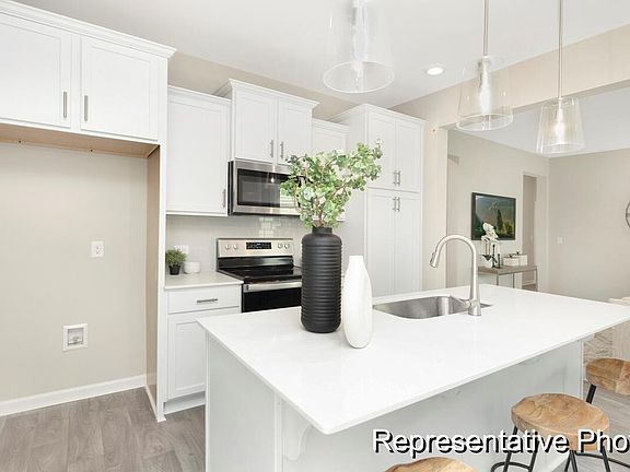 Canterbury ranch plan! 3BR / 2 BA features open great room with raised beamed ceilings, dining, nicely appointed kitchen with SS farm sink, SS appliances, upgraded cabinetry, quartz counters, and tile back splash. Primary bedroom features tray ceiling and ensuite. Upgraded lighting throughout and rear patio, perfect for entertaining.