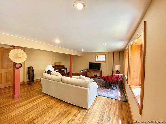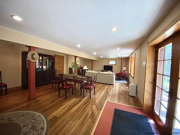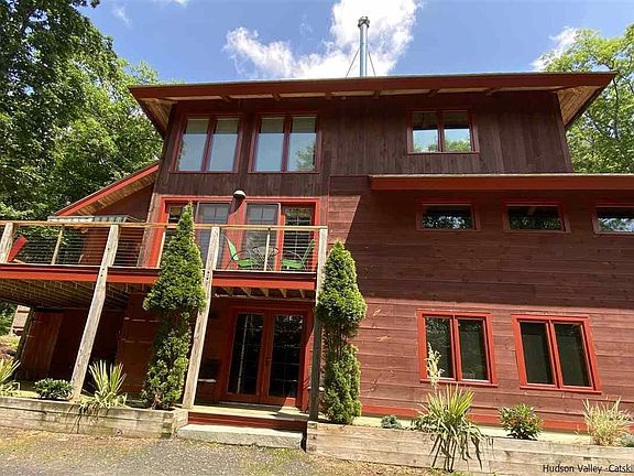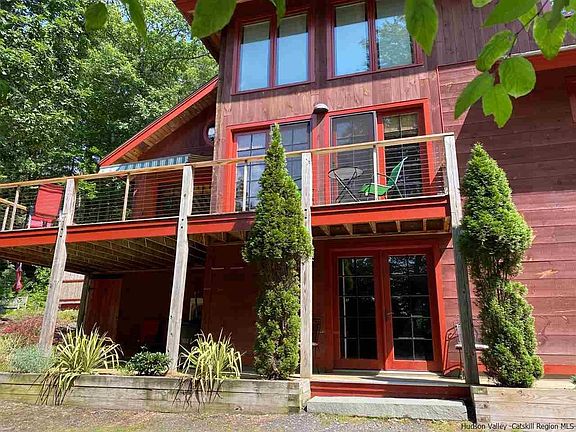 Tucked away on a private road in a very special area called Riverby and adjoining there is a 78+ acre parcel which is forever wild & for the use of all property owners. Additionally the area includes a mountain swimming hole. If you're looking for a place to call home within a community which values privacy and neighbors you'll love living here. This house was designed by long-time Woodstock resident architect Barry Price with the current owner. There are 3 bedrooms and 2 full baths. It is a traditional post-and-beam, engineered by Habitat Post and Beam. The design reflects an Asian influence with large overhanging eaves shading the windows beneath. Of note is the absence of gutters, which are superfluous to this type of design. Each level of the house receives direct sunlight. The siding is pine stained a deep rose. On the main floor is a large great room affording views of the back and front sides of the house from one sitting area. Pocket-style doors are incorporated to minimize spacial interruption. The kitchen includes a Viking stove along with custom Korean-designed cabinetry. The floors are maple, pine, bamboo and slate. The house has three large, round windows framing the mountain views. On the third level is a cordoned loft with two skylights directly over the sleeping area. On the same level is the master bedroom, which includes a walk-in closet. The master bath consists of a bathing area with a separate toilet closet. You enter through the first level which is over 1,000 square feet of space currently used as a family room and could easily accommodate extra guests or even an in-house office. You'll immediately fall in love with the vibe of this home - open and airy and a feel of being far away and yet at home. There are decks off the living room and the main floor bedroom and a retractable awning to provide shade. The living room is spacious with it's 2 story high ceilings accented by the beautiful post and beam and architectural details. There's even a woodstove to take off the chill in the early fall and late winter. The kitchen with it's work island provides ample space for shared cooking and although initially appearing modest it's ready to cook and accommodate a crowd. There's a spacious pantry off the kitchen to maximize storage. Walking up or down the stairs you'll be taken by the artistic simplicity of the stairwells which are the essence of the detail of this home. There is a bedroom and full bath on the main floor as well. Pocket doors throughout for seamless entry to rooms. Not to mention an abundance of divided light french doors. Exit through the french doors to a patio with fountain and place to barbecue or sit under the umbrella with your morning coffee or a evening drink. Walk a little further down the path and spend some time in the spacious hot tub with views of the mountain and feel like you're in the middle of a beautiful forest.