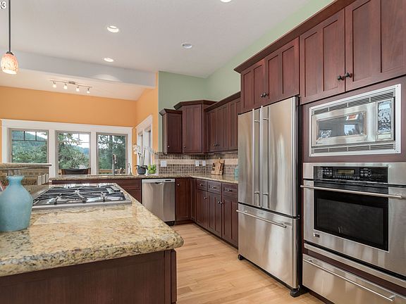 Stunning view of Spencer Butte! This incredible craftsman home is located in the desirable Solar Heights neighborhood of S. Eugene. Built in 2007 this grand home includes 5 beds, 4 full baths, & 3,755SqFt. Enter into the regal living room with a full wall of windows, views, gas fireplace, high ceilings & walk out upper deck. The kitchen features granite counter tops, SS appliances, island with cook top, eating bar and a walk in pantry. Enjoy your view from the primary bedroom on the main floor with walk in closet, beautiful bathroom & private deck. Second bedroom & laundry on the main. On the lower level you have 3 bedrooms, 2 full bathrooms along with a possible 6th guest room or office. The large bonus room is outfitted with a built in wet bar and leads into the attached media room that is already wired for sound -could be a great home gym. Utility/shop room has central vac. Walk out onto the lower patio where your hot tub & views await! Picturesque yard with permanent raised beds, level lawn, paver patio, greenhouse, mature fruit and berries, fully fenced and more! Solar Panels provide electricity. This dream home awaits you!