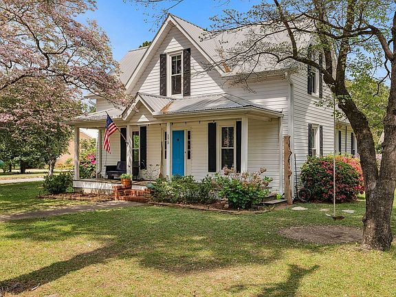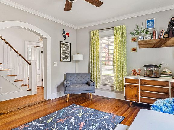 Step onto the inviting rocking chair front porch and into a home full of warmth and original details, including heart pine floors and classic trim work. The main level features a first-floor primary suite with a generous walk-in closet and a beautifully updated en-suite bath, complete with a double vanity and tile shower.