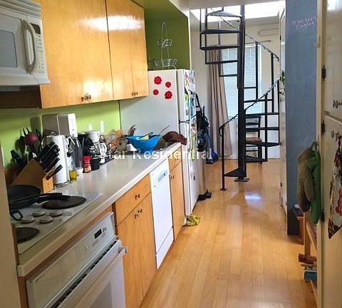 outdoor space, hardwood floors, laundry in unit, galley kitchen, spiral staircase Penthouse, hardwood floors, galley kitchen, laundry in unit, spiral staircase, outdoor space