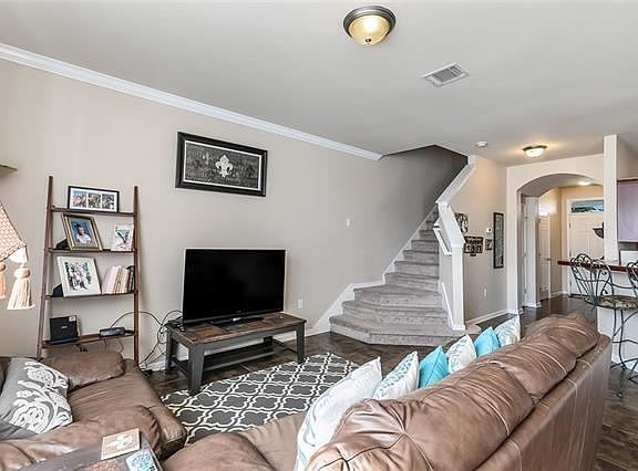 Inviting three bedroom 2.5 bath tastefully decorated townhouse.Den w/9 foot ceilings/recessed lights,tile floors & crown molding.Kitchen overlooks den & features attractive cabinets,breakfast bar,pantry,granite tile counters.Spacious master bedroom w/ trey ceilings,masterbath w/double vanities/tile floors.Two additional roomy bedrooms & attractive bath.Fenced in rear yard & patio. Storage room.Attached garage,community pool available for quarterly fee.HOA covers ext insurance,lawn care,termite & trash.