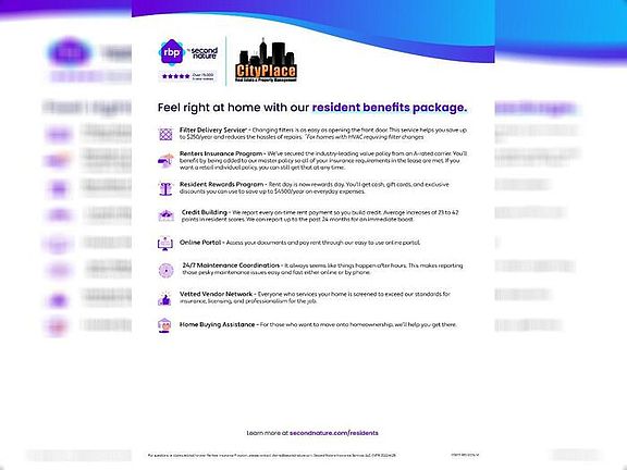 At CityPlace Property Management, we strive to provide an experience that is cost-effective and convenient. Thats why we provide a Resident Benefits Package (RBP) to address common headaches for our residents. Our program handles insurance, air filter delivery (for applicable properties), credit building, rent rewards and more at a rate of $39.95/month, added to every property as a required program. More details upon application.