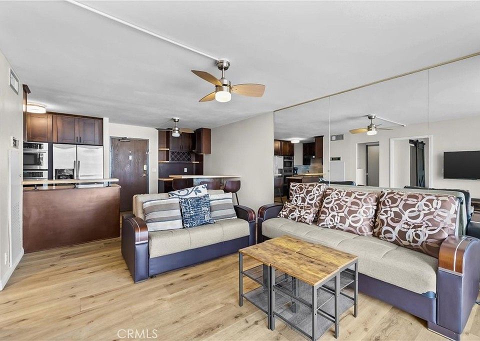Welcome to 1750 E. Ocean Blvd #403! This 1 Bathroom, 2 Bathroom condo in Queen’s Surf showcases ocean views with high-rise beach living! As you enter, you are immediately immersed into light and warmth of the sun shining in through the massive sliding glass doors. This unit comes with a generous number of upgrades. The updated kitchen features dark hardwood cabinetry (w/self-closing mechanisms), butcher block countertops, ceiling fan, s/s farmhouse sink and appliances and a built-in bar that includes a wine storage, liquor & drink ware cabinets and a high-top table with 4 stools. The unit has new laminate floor, new decorative lighting and bathroom fixtures and has been freshly painted. The living area is spacious has a wall mounted TV and ceiling fan. The ocean breeze hits as you step onto the tiled balcony and take in the sensational view of the golden sand and the blue water. The mirrored wall behind the couch is placed perfectly to reflect this stunning view no matter where you are in the home! You can also access the balcony from the Primary Suite which has been updated with dark wood sliding barn doors, ceiling fan and wall-mounted TV. There is a large closet with sliding mirror doors, separate vanity area and a Full Bath updated with oversized tile walls and multiple shower heads. This unit has one assigned parking space on the same floor and has 2 storage areas-the bottom would be ideal for a bike. With bike paths and parks just steps away, having a beach cruiser is a must! Residents enjoy the many amenities including a heated pool, hot tub & sauna, fitness room and recreation center with billiard table. The HOA also includes water, trash, insurance, FIOS cable TV and Internet and Earthquake Insurance! Ideally located near many local spots for recreation, shopping & dining which include Belmont Shore, Downtown LB, Pine Ave & Pier, Shoreline Marina, Rosie’s Dog Beach, Bixby Park and the Aquarium of the Pacific. Don’t miss you opportunity to wake up to the ocean everyday and live the beach life!