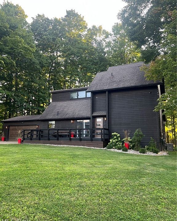 This property is Priced to Sell ....... Bonus Property with 2 City lots - with many woods/trees. You do not want to miss out on this one! Very nice updated curb appeal and inside the home the same. Contemporary design - cathedral ceilings with lots of natural light! The living room, dining area and kitchen are all open. Granite countertops and stainless appliances, updated lighting and flooring throughout. Formerly an enclosed 4 season room is now the large primary bedroom space. Full basement for additional square foot finish-able space or storage. The outside of this home has a front and rear deck - great for relaxing or entertaining. A rear concrete patio, treed and landscaped back and side yard. Low cost efficient utility bills - 2 car attached garage, central air, wood fireplace in the great room. This property has so much to offer. Contact your professional agent today to schedule a private tour.