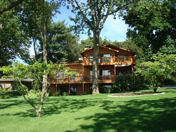 Custom Built one owner home Property consists of 2 lots each 97x227.for a total lake frontage of 194x227. There is a private boat dock and lift. Located at the end of Spitler Dr.. this contemporary home's front yard is on the lake.Master suite has whirlpool tub plus sauna. There are 2 see thru fireplaces, 5 skylights, central vacsystem, sprinkler system, carport as well as a 2 car garage.Large deck across front of home plus patio. Also greenhouse with motorized windows and beautifully landscaped lot.Walkout lower level has additional office, rec room and full bath.Please do not let cat out . Thank You
