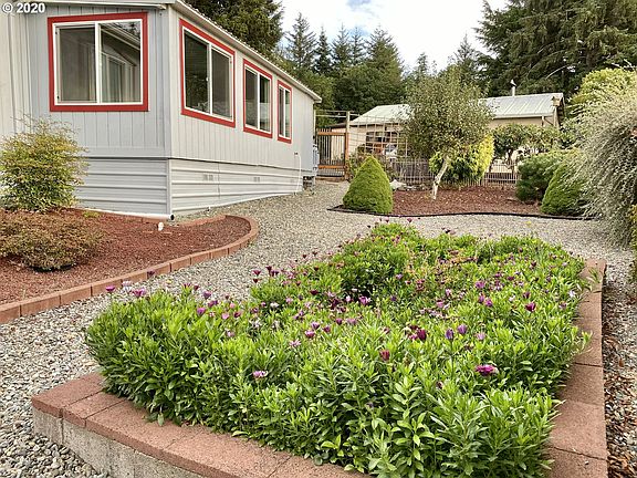Wonderfully maintained 1,344 Sq. Ft, 2 bedroom, 2 bath home in the 55 Plus retirement community of Shorepines Bay Village Park. Enjoy the Panoramic Ocean Views from the expansive sun room. Large fenced yard provides remarkable privacy. Oversized master suite with large walk in closet and large master bathroom with jetted tub. Space rent is $422.50 per month. Water, sewer and garbage runs approx. $70.00 per month. Secure living in the best park in Coos Bay. Roof is approx. 10 years old.