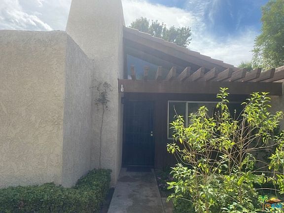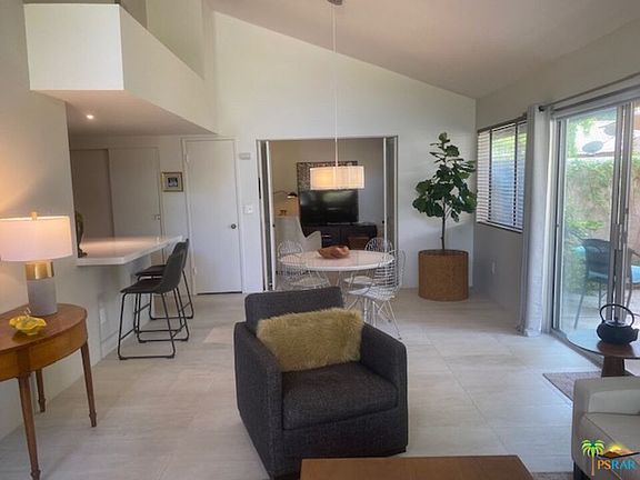 Welcome to Ridgeview, a small, quiet, gated community in South Palm Springs that offers park-like grounds and near to restaurants, retailers, hiking and one mile from PSP airport. This beautifully updated single-level single story 3 bed 2 bath condo boasts vaulted ceilings in the living/dining area as well as in the master en suite. The open galley kitchen boasts tile counter tops and stainless steel appliances. There is a gas bib in case you wish to switch from the electric stove to gas. Convenient access to the community pools, spas and tennis courts. Owner has put in new ceramic tile floors throughout, with carpet only in the guest bedrooms. Recent paint, energy efficient windows and sliding door that opens to the private patio with a view of the mountains. Plenty of storage in the two car garage. Great separation of bedrooms with the two other bedrooms on the other side of the house. Third bedroom can be a den/office/media room. Guest bathroom has a shower/tub. Full size washer and dryer in the kitchen. The HVAC is merely two years old. Short term rentals of 30 days or more permitted. This home is a must see!