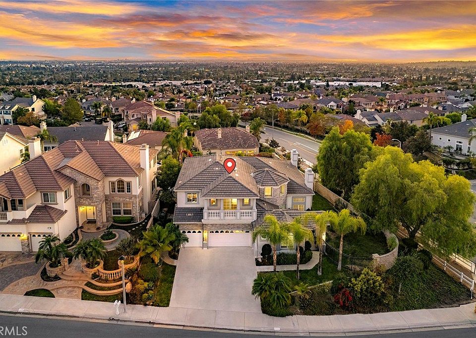 Welcome home to 17502 Edgewood Lane, a gorgeous pool home with an incredible views spanning all the way to Catalina in the prestigious Fairways neighborhood of Yorba Linda, just around the corner from Black Gold Golf Club. With a light and bright floor plan, this gorgeous home is impresses at every turn. Upon entering your new home, you are greeted by lots of natural light, stunning 2 story ceilings and crown molding. Starting on the main level of this beautiful home, you are greeted by a formal living and dining area off the foyer, complete with an elegant fireplace, a large family room also outfitted with its own fireplace, and a chef’s kitchen with a large island, breakfast nook, built in range, double ovens, and ample counter space perfect for any home cook. A large master suite boasting a spa like master bathroom with his and hers vanities, jetted tub, and a dual entry walk in shower, along with a secondary bedroom/office complete the first floor. Both the kitchen and the master bedroom have easy access to the stunning backyard. Upstairs are 3 more sizable guest rooms and a loft area. The backyard complete with a covered dining area, fire pit, and sparkling pool and spa is the perfect place to entertain or unwind after a long day and enjoy the spectacular views. Additional features include a 3 car garage with epoxy flooring and storage, a total of 3 fireplaces, and transom windows with custom window coverings.
