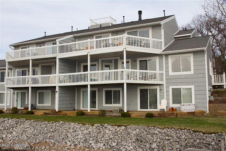 Completely upgraded waterfront condo, one of the best on Spring Lake! Starting with your very own 75' long contiguous boat slip, a 3rd story deck, designed kitchen with solid surface tops, custom cabinets and stainless steel appliances. Family room has vaulted ceilings, built in bookshelves, gas fireplace and view that is second to none. The master suite has a slider to the back deck and custom tiled shower that is gorgeous. Head downstairs to the built-in maple wood bar, custom designed office, more bookshelves and a full bath with slider to your patio. If you're looking for a ready to move-in condo with views, dock, fantastic kitchen, plush master suite and across from the SLCC then this one should be at the top of your list.