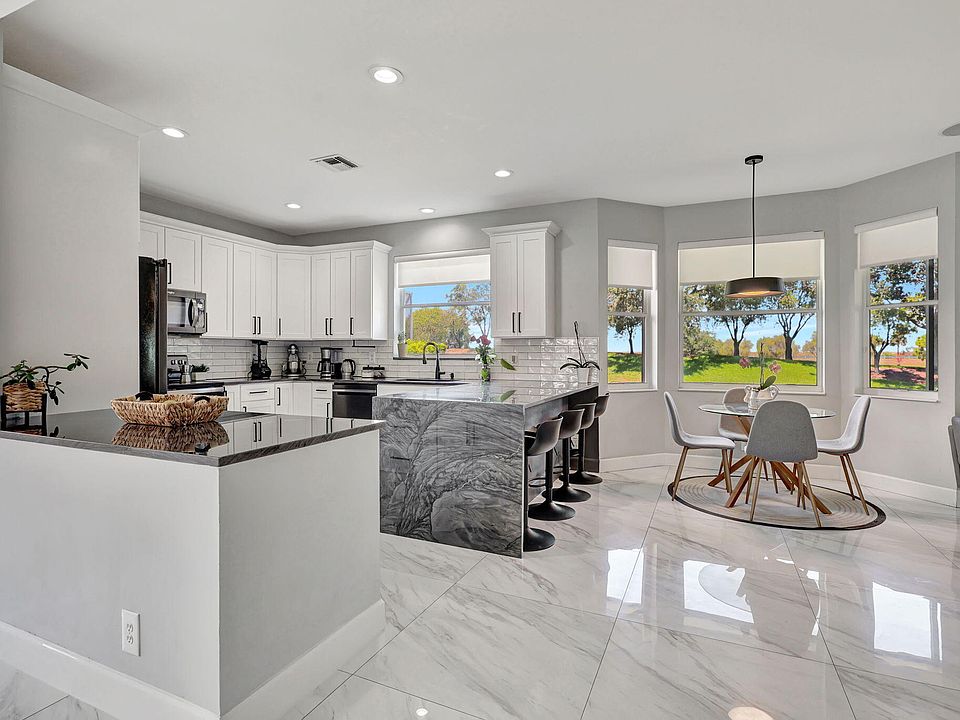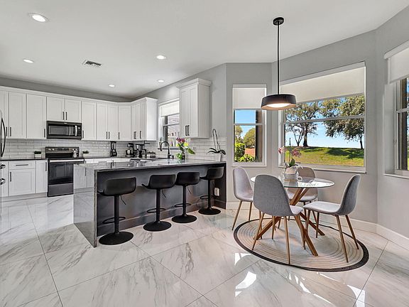Step into your completely remodeled dream home! This oasis boasts an exquisite 4 bedroom, 3 bath layout with a 3 car garage, ensuring ample space for all your needs. As you enter, be greeted by the grandeur of a spacious formal living and dining area, adorned with gleaming new tile flooring that leads you effortlessly throughout the first floor. Prepare to be enchanted by the heart of the home - the stunning black and white kitchen, a masterpiece designed for both culinary adventures and entertaining soirees. With brand new cabinets, sink, faucets, countertops, lighting and top-of-the-line appliances, every meal will be a gourmet delight. Nearby, the family room opens to a covered screened patio, perfect for dining, enjoying cool breezes, and warm conversations with loved ones. *MORE Retreat to your own sanctuary in the primary suite, and relax in the spacious, stunning & luxurious modern spa bath. Enjoy the extra sitting area space and private balcony offering unobstructed sunset views over the manicured golf course and nature preserve.