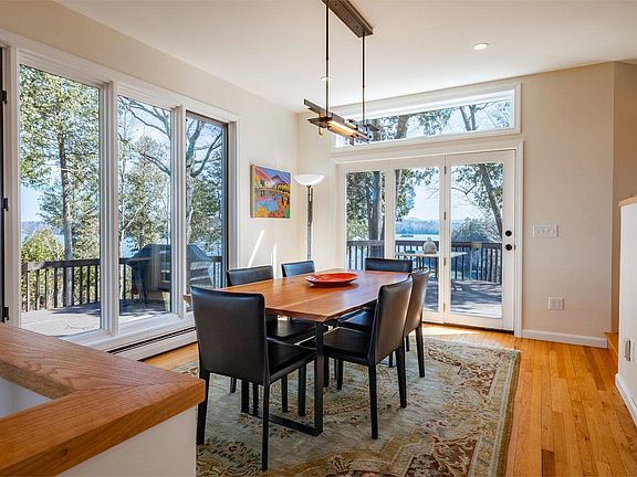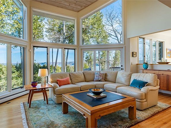 Serenity awaits you at this remodeled 3+ bedroom home with 180 degree views of Lake Champlain. Walls of windows overlook the private 2.6 acre lot with 810 feet of lake frontage. Take in the view from the updated eat-in kitchen with large island, granite counters, upgraded appliances, and cozy gas fireplace. Step down to the dining room that opens to wrap-around decks facing east and north. Large family room with floor-to-ceiling lake-facing windows has cathedral ceilings and fireplace. Private first-floor primary with remodeled bath and balcony to enjoy the view. Second floor has new study or second primary with gorgeous tiled shower and natural views through the trees. Two additional bedrooms with gorgeous new bath with heated floor and a view from the tub! Mezzanine-style family room for additional living space on the second floor. New, heated 2+ car garage with space above for future living area, currently used as workout space and storage. This house gets great light and is situated to take in the lovely lot that wraps around Marble Island creating a private oasis. Lake access is a private cove accessed by stairs through beautiful trees and gardens. The cove has a beach and large slab rocks for swimming. Well-maintained with newer heating system, mini splits for AC, and generator. Less than 20 minutes to downtown Burlington with nice proximity to the bike path. Showings begin Friday April 19.