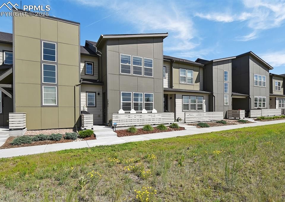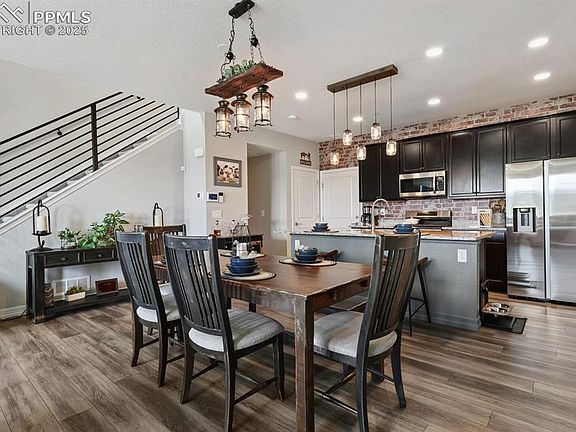 Welcome to low-maintenance living in The District at Victory Ridge! Enjoy direct access to a park with soccer fields, basketball court, workout stations, playground, and beautiful mountain views, right outside your front door. Located in the Academy 20 School District, this 3 bed, 3 bath home offers 1,700 sq ft of well-designed space with luxury vinyl plank flooring and thoughtful upgrades throughout. The open main level features a spacious living area with custom light fixtures and a kitchen equipped with stainless steel appliances, gas range, pantry, and large island perfect for entertaining. Upstairs, the primary suite includes a walk-in closet and private bath with dual vanity. Two additional bedrooms, a full bath, and upper-level laundry with washer and dryer included add everyday convenience. The custom iron stair railing adds a modern design touch, and the tankless hot water heater means you will never run out of hot water again. The front porch overlooks the park and faces south for year-round sunshine. With walkable access to restaurants, shopping, and the movie theater, plus quick connectivity to I-25 and the Interquest corridor. Whether you're sipping coffee on the porch or walking to dinner and a movie, this home makes it easy to enjoy where you live!