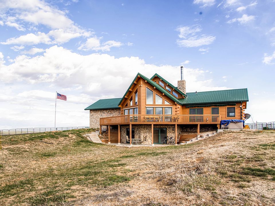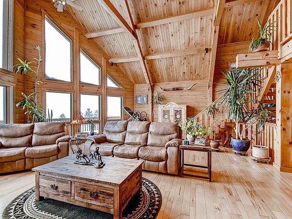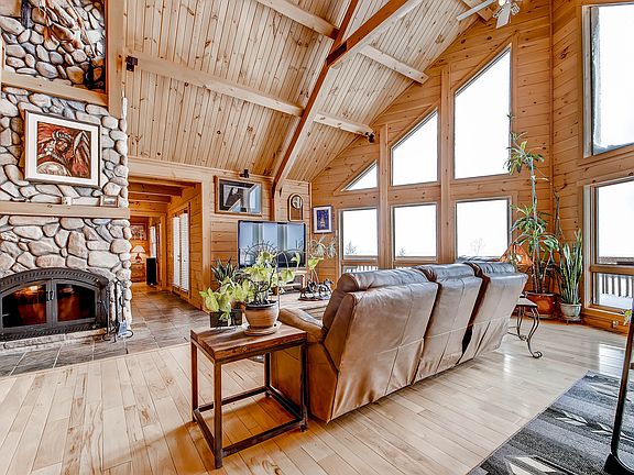 Welcome to High Plains Ranch! 20+ Acre Ranch -* Perfect cultivating and warehousing opportunity. Gated Security Entrance w/ tree-lined drive.Glorious Mountain Views. Log home w/ bright open floor plan and loft perfect for recreation room &/or office. Floor to ceiling windows allow gorgeous views & natural sunlight year round. River rock floor to ceiling gas fireplace. Open kitchen w/ slab granite & gas/propane cooktop plus dble ovens. Lower level is also fully finished! Gorgeous slate, wide plank hardwoods, exposed beams, trusses & a huge wrap around deck.Oversized steam room & sauna!*Fully-fenced*4 pastures*panel fencing*30'x60' shop w/ 10' overhang*600 bale climate-controlled hay storage shed*huge barn*heated tack room*Vet area*wash bay & heated auto-waterers!*Heavy-gauge metal sheds in all pens, stalls & pastures (9 loafing/1 storage), solid-wall round pen & stadium-lighted roping & training arena!
