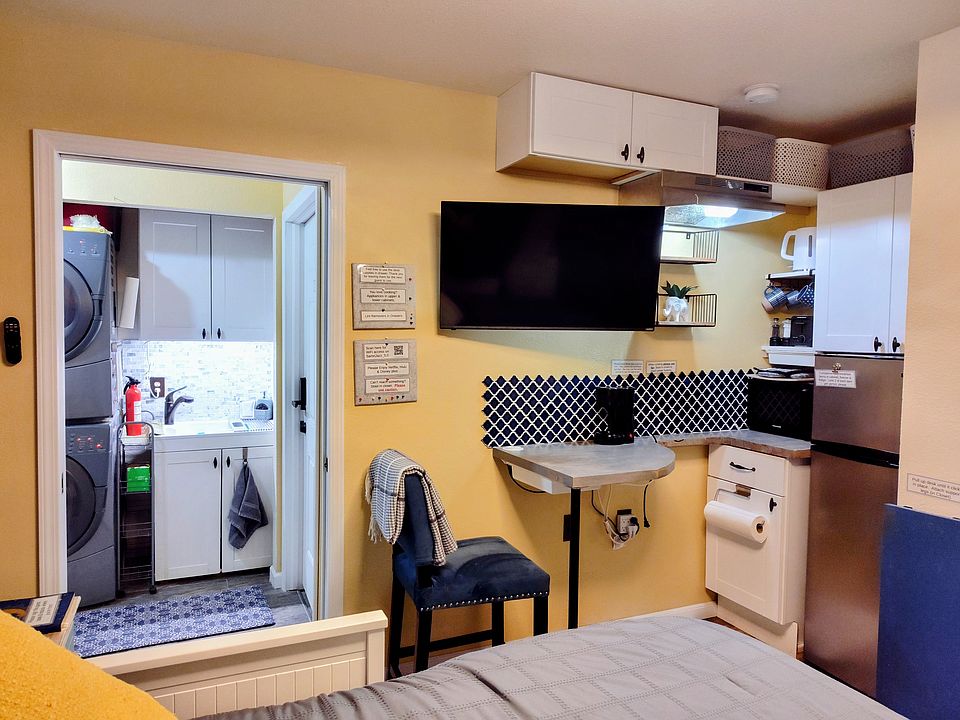 Private bed and bath suite w kitchenette (w apartment fridge, microwave, ninja foodie cooker, electric skillet, convection toaster oven, hot water pot etc & shared laundry. Smart TV in room