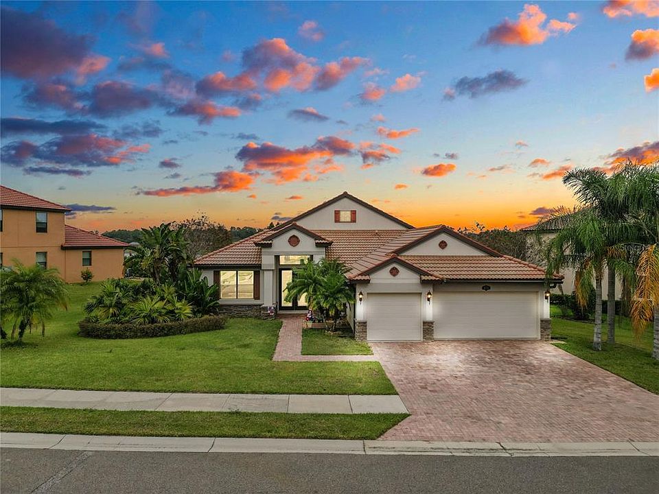 Welcome to this stunning K Hovnanian Homes built Aruba model WATERFRONT home including tons of beautiful upgrades throughout with a backdrop of picturesque views of Meadow View Lake! Enjoy peace and privacy in Terra Largo, an exclusive GATED community with lush features including a pool, clubhouse, pickleball courts and fitness center. As you approach, you'll love the convenient 3 car paver driveway and sidewalks. The front double-entry doors open to reveal the incredible upgraded trim work first noticed in the foyer which is found throughout the home. To the left of the foyer are French doors which provide access to your own home office or study complete with brick paver flooring. Across from the study you'll find the formal dining room with a tray ceiling boasting exposed structural beams and a lovely accent wall. As you enter the main living area adorned with crown molding, recessed lighting, built-in multi-room audio system and glass sliders which open to the rear screen enclosed lanai. The kitchen includes quartz countertops, solid wood cabinets with custom pull-outs, walk-in pantry, brick paver backsplash, bar overflow seating for guests, separate breakfast nook, and stainless-steel appliances. Enjoy the convenience of the inside laundry room which is already plumbed for a utility sink and has an adjacent "drop zone" for shoes, jackets and backpacks. The main bedroom suite in this triple-split plan home makes for the perfect retreat including a sitting area, tray ceiling, water views through the bay windows, his and her closets, plus a granite topped dual sink vanity, stand up glass shower, garden tub with custom tile accents, and water closet in the attached bathroom. The remaining 3 guest bedrooms are very accommodating and display more custom trim work and aesthetically pleasing paint schemes. Entertain a houseful of guests with ease and comfort added from another 2 bathrooms, both of which exhibit tub/shower combos. The back bathroom exits to the lanai. From the lanai, enjoy cool evenings and painted sunsets shimmering across the lake or step out onto the custom composite deck and relax under the stars with your favorite beverage or barbeque. Take advantage of this unique opportunity to own your private paradise in Terra Largo and schedule your private showing today!