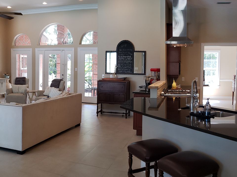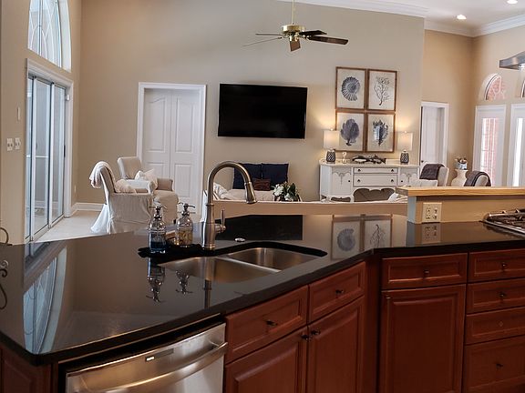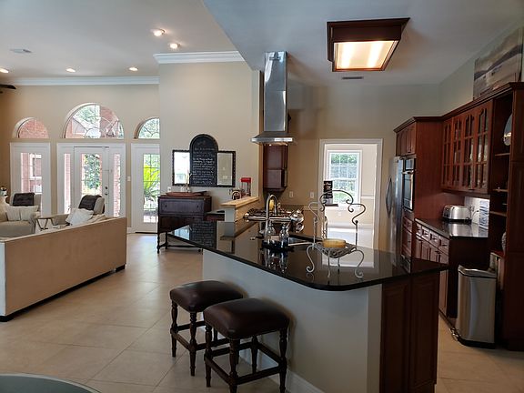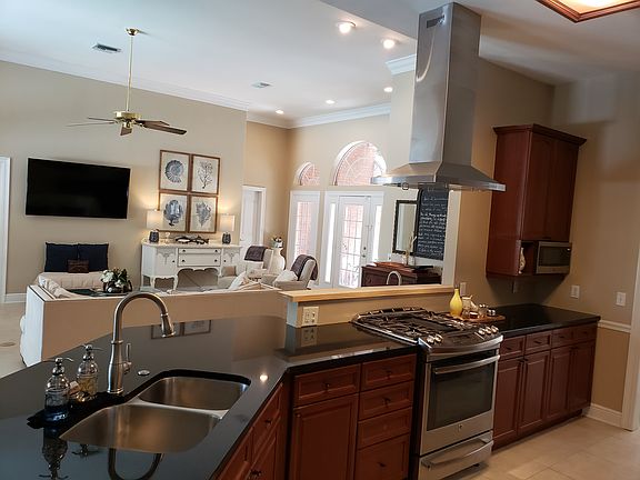 On the bay with a covered boat slip with lift. One level luxury living. What a view! Situated on 100 feet of canal frontage at the mouth of the bay with a boathouse and lift! Peaceful and secluded setting, with pool, lush landscaping, mature live oaks and magnolias, and fenced in back yard. This four bedroom plus office home has a floor plan that's perfect for family and entertaining. Large great room with built-in entertainment center and wet bar overlooking the pool as you enter. Formal dining room with built-in buffet, kitchen with granite counter tops and custom cherry cabinetry, huge pantry with shelving with space for an additional refrigerator and freezer, and breakfast area overlooking the pool. The master suite features a spacious bedroom, large bath with walk-in shower, raised jetted tub, 2 large walk-in closets and an adjoining room that can be used as an exercise room, study, office or media room also overlooking the pool and bay. Split bedroom floor plan with three additional bedrooms, one of which overlooks the pool. This home has plenty of storage space, lots of closets and floored attic space accessed by an enclosed stairway in the garage. Just off the garage is an air conditioned storage/workroom with lots of cabinets and counter space. Additional custom features include 10' -14' raised ceilings, trey ceilings, crown molding, art niches, recessed lighting. Enjoy relaxing on the landscaped pool deck that can be accessed from the living room, breakfast room. There are 2 master suites and 1 private 2 bedroom suite. Incredible reworked floorplan maximizes the space. Gournet kitchen is open to great room and pool area, all new appliances and hood range with gas cooktop, 2 ovens, large butlers pantry. Incredible work room is air conditioned off garage. All new trav flooring throughout. Modern and updated throughout.