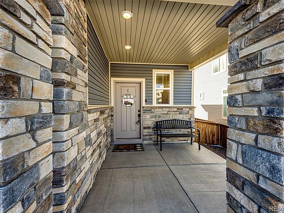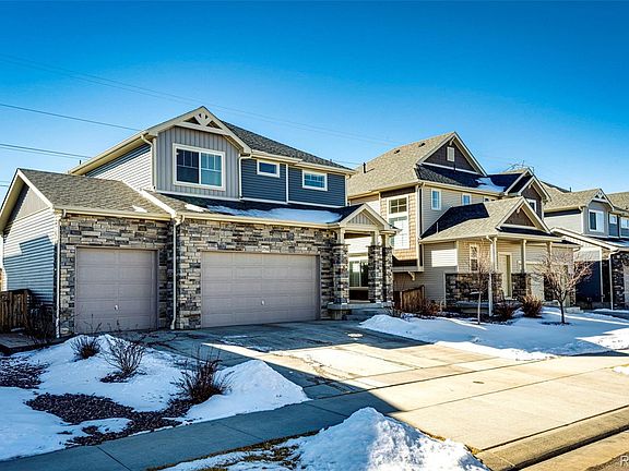 This Newer Oakwood Two-Story home is ready for you to move right in! No neighbors directly behind you! Enjoy the mountain range views from your nice sized sunny backyard, deck and stamped concrete patio! In the springtime you will enjoy the beautiful landscaping with drip system. Sprinkler System installed in front and back. Homeowner has upgraded the home with a "Culligan Aquasential" Select water softener; Culligan whole house water filtration system and Culligan reverse osmosis system at kitchen sink. A Security System was also installed for sensors on the open windows on main level and basement. Two remotes clickers for the system and all outside doors. Can upgrade to monitored smoke detectors. Also included is the Ring Doorbell. Well known Shaw Flooring vinyl planking flooring installed on the main floor and upstairs for easy maintenance and waterproof with lifetime residential warranty. The upstairs carpet area was upgraded to Mohawk carpet with an 8 lb pad including a moisture barrier and memory foam. This is a great location with easy access to E-470 for any commute from the North to South. The Reunion Hometown community provides trails, parks, recreational center, pools you would expect living the Colorado life.