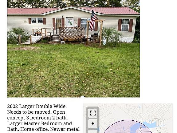 NEEDS TO BE MOVED. 2002 Larger Double Wide. Needs to be moved. Open concept 3 bedroom 2 bath. Larger Master Bedroom and Bath. Home office. Newer metal roof. New central Air Conditioner. New hot water heater. Some cosmetic TLC. Buyer responsible for moving. Clean title. No liens. Serious inquiries only. No rent to own. No owner financing.
