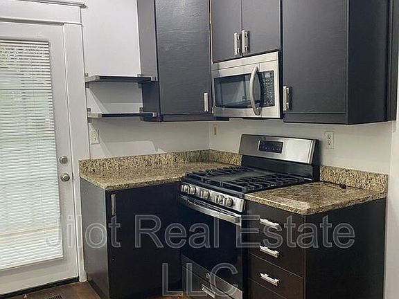 East Point Center Park bungalow ranch home with front porch, large rear deck, garden area, partly shady yard. Large rooms and high ceilings, heart of pine floors. Master w private bath w dual vanities. Good closet space. Kitchen w gorgeous dark cabinets, stainless appliances, and granite counters. Available immediately. $60 application fee, security deposit equal to one month rent, 12 month lease.