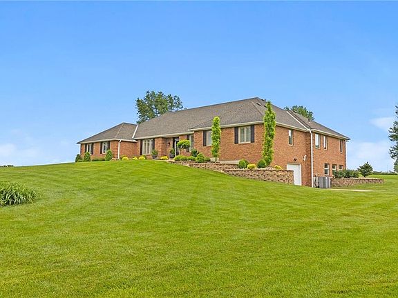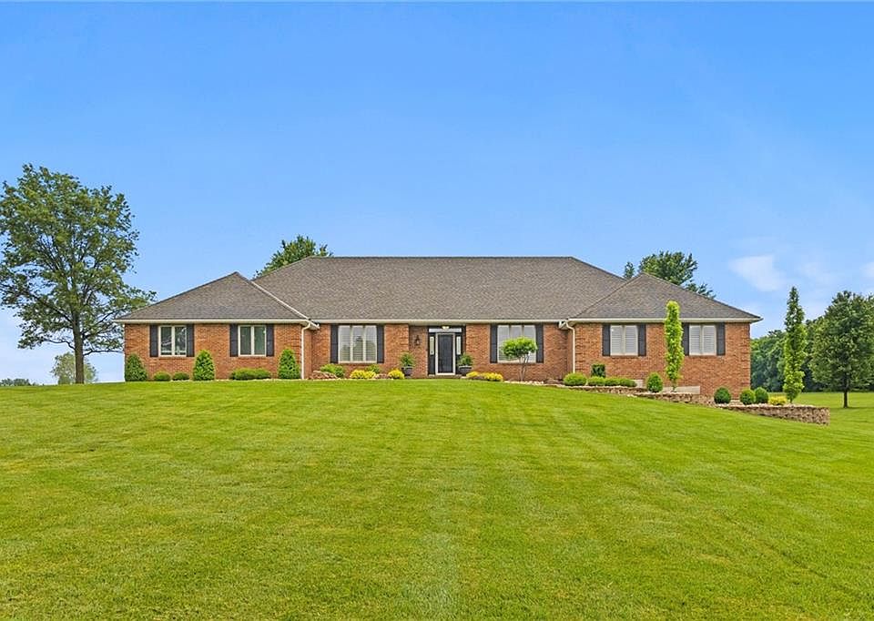 Welcome to this meticulously maintained, all-brick ranch nestled on 6.83 acres of serene land. Boasting 4,975 sq ft of living space, this home offers a perfect blend of comfort and luxury. The open floorplan on the main level is ideal for both relaxation and gatherings, highlighted by a generous kitchen with two pantries and newer appliances, a formal dining room, and a large living room with inviting fireplace. The primary bedroom is spacious with an updated bathroom featuring large shower tile floors, double vanity with built-ins and separate make-up desk. The finished lower level is an entertainer's dream, featuring a spacious family room with a cozy fireplace, a convenient kitchenette/bar, and a large bedroom with an en-suite bathroom. The oversized three-car garage is a car enthusiast's delight, complete with high end polyasparatic coating and built-in slat wall and cabinets (all done by Hello Garage) for optimal organization. For those with additional storage needs, the basement includes a fourth car garage and huge storage room both also done with high end polyasparatic coating by Hello Garage, providing ample space for vehicles and other belongings. With its expansive living areas, thoughtful details, and picturesque acreage, this home offers a rare opportunity for comfortable, upscale living in a beautiful natural setting. ATT Fiber Internet available!