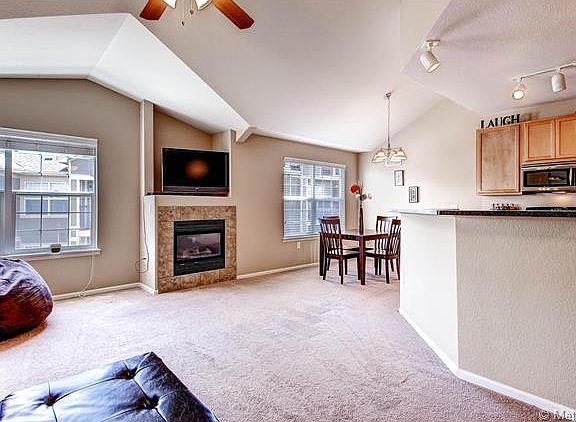 Rare opportunity to own this Beautiful Penthouse End Unit with Vaulted Ceilings! With the largest floor plan in the complex, this 3 Bedroom, 3 Bath home is Spacious Bright and Open! 2 Full Baths and Bedrooms on the Main Level with a Loft/3rd Bedroom upstairs with a Closet and Full bath! There are two balconies for relaxing enjoyment... Gourmet Kitchen with Granite Counters, 42" Maple Wood Cabinets, All Stainless Steel Appliances included and Large Eating Bar! Formal dining area too! Cozy Gas Log Fireplace in Great Room with Vaulted Ceilings, Ceiling Fan and door out to Balcony! Loft area gives extra living space for bedroom, or use for office, family room, or other! Large storage area under the stairs and on balconies. Also has inside sprinkler system - added safety plus! Unit includes 1-Car Detached Garage! Short walk to the Cherry Creek Trail system, and close to shopping and Restaurants! Clubhouse offers fitness and exercise areas along with a wonderful community pool. Make your appointment today! Won't last long!