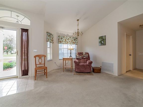 An excellent value for this 2 bedroom, 2 bath, 2 car garage located in the very popular 55 plus community of Stonecrest. Shopping, restaurants, medical facilities and The Villages town squares are all very close by. This very nice home is located on a corner lot and features an enclosed lanai, a master bath with a large walk-in closet and a eat-in kitchen. The interior laundry room has a new washing machine. The large 2 car garage has a side door exit. This professionally landscaped home is located in a very quiet neighborhood and is close to a community golf course, an indoor and outdoor pool, a recreation center as well as tennis and pickle ball courts. There is also a softball field. A one year home protection plan is included. A golf cart is available for separate purchase.