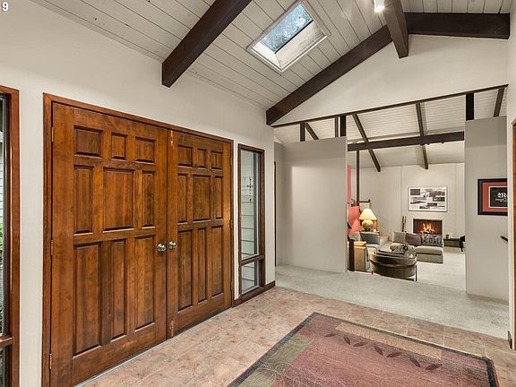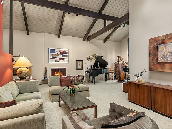 This is a fun house...inside and out. Very cool mid-century modern vibe with dramatic ceilings, great natural light, oversized windows in every room, skylights, big open rooms, beautiful fireplace in cozy sunken living room. A few easy steps inside make this a good one level alternative. Lots of storage and easy access to yard, patio and deck.
