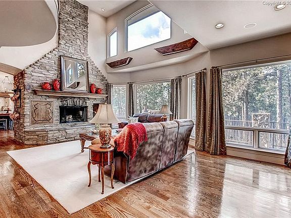 Enchanting custom story home nestled in the towering pines of The Timber on 2.5 acres. Welcoming covered entry with a solid wood door that leads to an open foyer. Two story great room w/ wall of windows bringing in light and framing the peaceful views, gleaming hardwood floors and a floor to ceiling stacked stone fireplace, Dream kitchen features; center island with cultured marble counter and vegetable sink, top of the line ss appliances, 6 burner gas cook top w/ imported French Chateau hood, granite counters, walk-out Breakfast nook & French Provencial stone fireplace w/ antique French mantle. Main level office with glass French doors, formal dining room and cheerful sun room to enjoy your morning coffee complete the main. Detailed curved stairway with wrought iron railings lead to the upper level featuring a stunning vaulted master suite that walks out to a private balcony, double sided fireplace, adjoining master spa w/ tumbled marble floors, Jacuzzi tub, two person steam shower, built-in cabinets and his and her walk-in closets. Three spacious bedrooms w/ built-ins, window seats and adjoining baths complete the upper level. Two separate entrances can take you to the walk-out lower level family room/ rec room, exercise room w/ full length mirror and additional bedroom with adjoining bath; ideal for guests, craft room and loads of storage. Multiple outdoor living spaces to include a large Trex deck off the main floor with Bose outdoor speaker system, outdoor fireplace and a lower level covered patio. Security system, whole house speaker system through most of the house, laundry chute, Pella windows, finished garage, 2 hot water heaters, sprinkler system and so much more! A true dream home you won't want to miss.