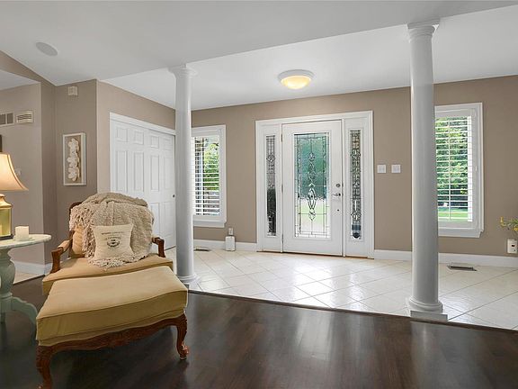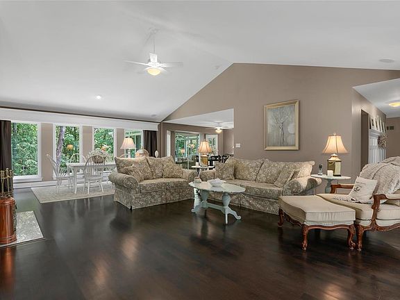 Pull up and prepared to be amazed from the second you park the car! Beautifully maintained and landscaped yard welcomes you to one of the best lots in the entire Radcliffe Place Subdivision! This remarkable 4 bedroom, 3.5 bath, ranch-style home with over 3,900 square feet of living space is nestled on 1.76 acres backing to woods - a surreal, peaceful nature setting! Gleaming hardwoods and soaring vaulted ceilings invites you inside this divided bedroom floorplan. Find a huge great room with well-appointed gas fireplace flanked by built-ins and a Chef's dream kitchen featuring a large center island and double wall ovens. Relax in the fabulous 4-season room overlooking the park-like backyard. Premium finishes throughout the home with plantation shutters, hardwood floors, invisible pet fence, irrigation system, finished lower level and a 3-car oversized side entry finished garage - great for the project lover! Terrific location: close to major highways, shopping, and restaurants. Additional Rooms: Sun Room
