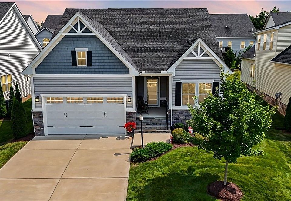 From the moment you arrive, you'll be greeted by a manicured lawn & elegant stacked stone accents, leading you to a welcoming front porch. Step inside to a spacious foyer adorned w rich LVP flooring & recessed lighting, setting the stage for the rest of this cozy home. A convenient drop zone near the garage entrance is perfect for stowing jackets, purses, & shoes. A separate den offers versatile use as an office/guest room. The heart of the home is the designer eat-in kitchen, where you'll find quartz countertops/tile BS, pendant/recessed lighting, a spacious island w bar seating, SS appliances, gas cooking, & a large pantry.The airy living rm boasts NEW carpet & recessed lighting, creating a comfortable space for relaxation. A convenient laundry room is located steps from the primary bdrm. The owner's suite is a cozy retreat featuring NEW carpet, an expansive W/I closet, & a luxurious en-suite bath w a tile floor, raised-height dual vanity, & a oversized tile shower w bench seating. The 2nd bdrm is bathed in natural light & the main bath has been thoughtfully upgraded w tile flooring/tile shower/tub combo, & sleek quartz countertops. Enjoy your evenings on the covered porch w/o worrying about yard work, as it's all taken care of for you! Charleston Club offers its own private pool, clubhouse, fire pit, & bocce ball court. As a resident of Magnolia Green, you'll have access to an impressive array of amenities, including an aquatic center, walking paths, championship golf, social activities, a golf shop/restaurant, & tennis/pickleball courts. Experience effortless living with world-class amenities – this home truly has it all!