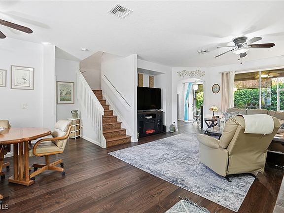 Welcome to this beautifully updated 3-bedroom plus den home in the desirable gated community of Timberwalk. Featuring luxury vinyl plank flooring throughout both levels, this residence offers a thoughtful layout with a spacious living room accented by an electric fireplace and TV nook, a front dining room, and an updated kitchen with granite countertops, stainless steel appliances, and a generous walk-in pantry. Sliding doors from both the kitchen and living room open to a private screened lanai with a covered outdoor living area and additional exterior storage. Upstairs, the primary suite features double closets plus a walk-in closet, Large en-suite with soaker tub and walk in shower. Split floor plan with two guest bedrooms sit across from the den—ideal for a home office or playroom—along with an updated guest bath and linen closet for added storage. A refreshed half bath located on the main floor, and the one-car garage connects through a convenient laundry room. The double driveway accommodates 2+ cars, and the landscaped entryway provides great curb appeal. AC replaced in 2021; furniture negotiable. Timberwalk offers a prime Fort Myers location along Three Oaks Pkwy with quick access to I-75 for an easy commute, and is minutes to FGCU, RSW Airport, and Gulf Coast Town Center. Community amenities include a fitness room, pool, playground, dog walking areas, and BBQ gazebo. This neighborhood offers excellent rental potential for investors.