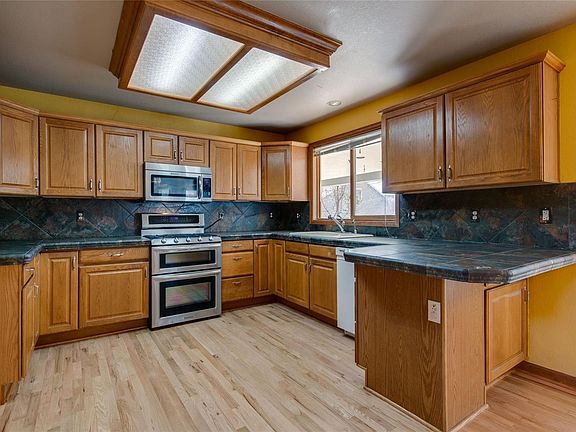 Spacious home in a quiet cul de sac with great floor plan in the desirable Trails subdivision which backs to open space and trails! This area has a country feel, yet it is close and convenient to Golden, shopping and West Woods golf course. The kitchen is open to the family room with a gas fireplace. It has a built in desk area with a gas stove and double ovens. The main floor bedroom could be a second master. Upper level has three bedrooms, two full bathrooms, including master five piece bathroom with a jetted tub. Basement could be mother-in-law space with own family room, bathroom and bedroom. Three-car finished and heated garage has built in cabinets, a laundry sink and 220 electric. This home is clean and move in ready with newly refinished wood floors and a brand new furnace! The large wrap around covered patio is perfect for outdoor living!