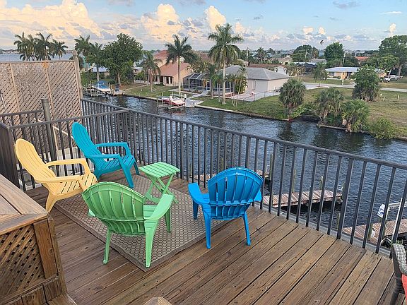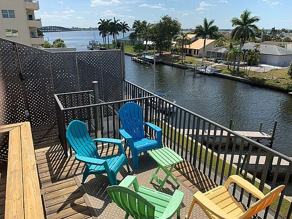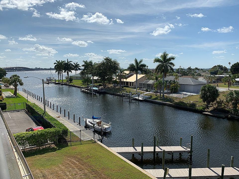 This charming, updated gulf access condo sits in the heart of downtown Cape Coral where you'll enjoy breathtaking views of the river from your private rooftop oasis. It's the perfect spot for sunsets, cookouts, or just lounging around. Spacious enough for all your friends and family with plenty of seating, an awning and misters to keep you cool, additional lighting since you may never want to leave and a half bath so you'll never have to! You'll also love refreshing dips in the waterfront pool and quick access to open water as this unit includes a dock with boat slip and lift, currently housing two jet skis but can easily be converted for a boat. The HVAC system and water heater were replaced this year and the unit is being offered turn key so there's nothing to do but settle in and start enjoying paradise! It's just a short stroll to the entertainment district for shopping, dining, and many of Cape Coral's most popular festivals or a quick trip over the bridge to Ft. Myers for a visit to SW Florida's beautiful beaches. There's covered parking, additional attic storage on the roof, and water is included with the dues.