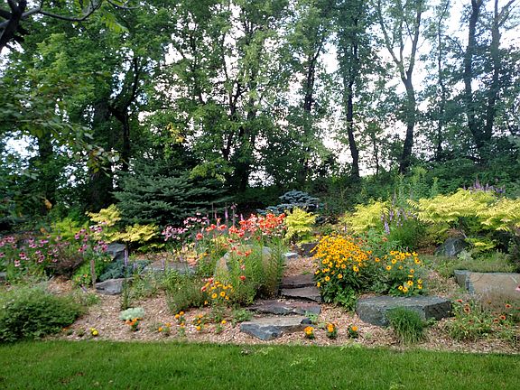 Well maintained two story with open floor plan + oak hardwood floors. Main floor family room with gas fireplace leads to gourmet kitchen with new quartz counter tops, new stainless refrig, new dishwasher, sink, faucet + garbage disposal. Main floor mud room, 3 car garage. Four bedrooms up including full master bath with whirlpool tub. Family sized formal dining with built in antique hutch. Walkout level amusement rm, full wet bar, heated floors, 3/4 bath and home theatre room (could easily be a 5th bedroom). Perennial gardens, irrig system + pond views.