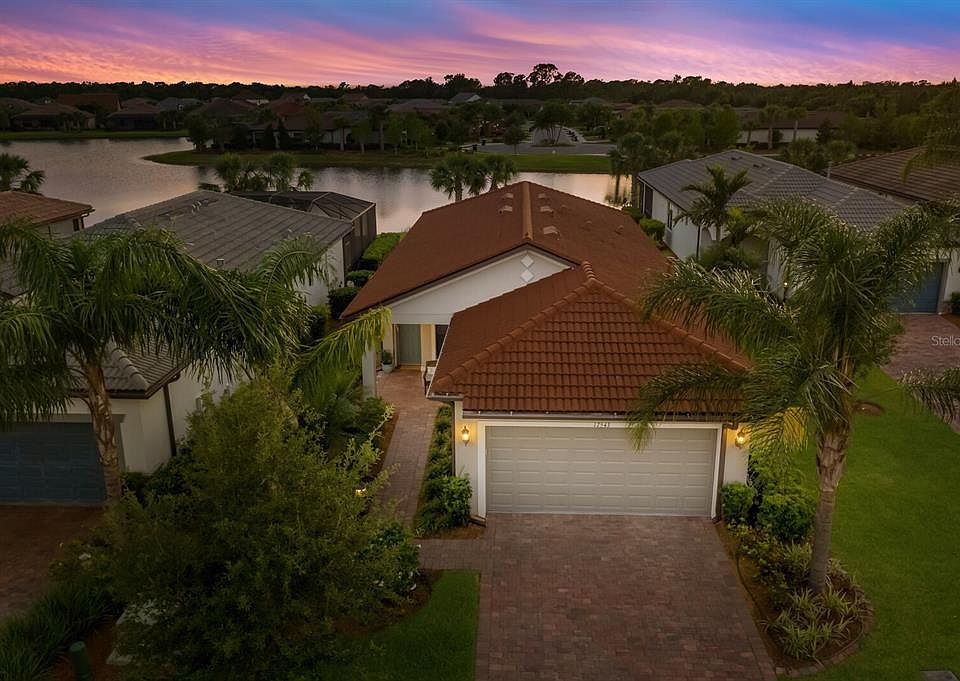 This stunning house features 2 bedrooms, 2 baths & a den with an exceptional Western facing water view that is sure to take your breath away every day. As you enter, you'll be greeted by pristine white kitchen cabinets that lend a timeless elegance to the space. With a Taft Floorplan, this 1425 square feet house is the perfect size for those looking for a comfortable home with plenty of room to stretch out. One of the highlights of this home is the extended Lanai, complete with a retractable remote-controlled, motorized awning. This outdoor living space is perfect for entertaining guests or relaxing and taking in the gorgeous views. The garage is a homeowner's dream, with extensive heavy-duty ceiling-hung storage racks to keep all your tools and equipment organized. Additionally, the garage is air-conditioned, making it a comfortable space to work on your projects, even in the hot summer months. All windows in the house are tinted, providing added privacy and reducing the amount of heat that enters the home. The front door also has a retractable screen door, allowing you to enjoy the beautiful Florida breeze without worrying about bugs. This 2 bedroom 2 bath home features ceiling fans in all rooms and the Lanai, ensuring that you can stay cool and comfortable year-round. You aren’t just buying a home, you are buying into a resort-style community Del Webb is a 55+ maintenance free community with an incredible amenity center and impressive list of recreational opportunities including 6 tennis courts, 8 pickle ball courts, 4 bocce ball courts, spa, outdoor bar, full restaurant, state-of-the art fitness center, resort-style pool with lap and an abundance of social activities with a full time Lifestyle Director. Your new home awaits you.