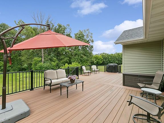 A stunning, move-in-ready home nestled on a scenic lot with mature trees, offering beauty inside and out. This one-owner property is a true tranquil oasis, featuring four main-level bedrooms, including a spacious primary suite with a private full bath. Recent updates include new waterproof LVP flooring, upgraded moldings on the main floor, new cabinetry in laundry room with bench and locker style coat storage and new shingles in 2024. The inviting living room boasts a new stunning 48” electric fireplace and media wall with a hearth and mantle, creating a warm and elegant focal point. Additional highlights in the lower level include in-floor heating, and a second full kitchen with an island—perfect for entertaining. Enjoy outdoor living on the maintenance-free deck with ambient lighting. Current homeowner open enrolls in Becker School District and bus stop is across the street. A must-see home that blends comfort, style, and convenience!