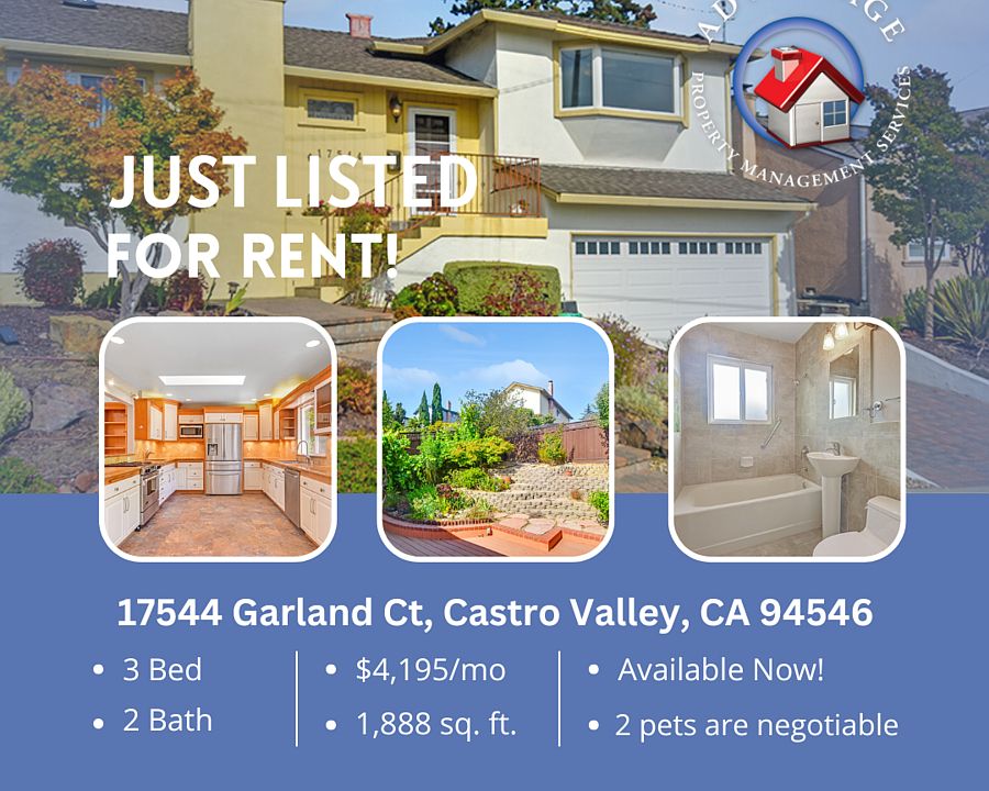 Schedule a Showing Online Come see this lovely 3 bedroom, 2 bathroom, 1,888 sq. ft. home located above Lake Chabot Rd in the Castro Valley hills. Along with the beautiful and well-maintained yards, this spacious home has a spectacular view of Lake Chabot Regional Park. This is a split-level home with a finished basement. The upper floor has three bedrooms, and two full bathrooms with the master bedroom featuring a fantastic view from its bay windows. The home is equipped with solar panels that will help keep your electricity bill nice and low, and it has an attached 2-car garage that has a 220V outlet for all your E/V charging needs. The large well-designed backyard has ample space to entertain guests and really completes the home. The neighborhood is part of the Castro Valley Unified School District with nearby schools including Chabot Elementary School, Creekside Middle School, and Castro Valley High School. Available for move-in ASAP Rent: $4,195.00/month Security Deposit ranges from $5,245.00 - $8,390.00 unless you qualify for our zero security deposit option provided by Obligo. Applicants that do not meet all the Basic Criteria, but exceed the Minimum Criteria, may be approved with a higher security deposit. If you qualify for Obligo's service, you will not be required to pay a security deposit! Lease Term: 12 months Pet Policy: 2 pets max negotiable with a $500/pet security deposit increase and a $30/month pet admin fee for the first pet plus $20/month for additional pets. Applicants with pets are required to submit a pet application through a third-party pet screening service at https apms. Refrigerator: Included Washer/Dryer: Included Gardening: Tenant maintained Parking: 2-Car Garage Utilities: Tenants are responsible for all utilities Showings are available by appointment only. Schedule a showing online by clicking the Schedule a Showing link. The property is professionally managed by Advantage Property Management Services. Leasing Contact: Harrison Smith (DRE# 01902063) READ THIS IMPORTANT INFORMATION BEFORE YOU SCHEDULE A SHOWING There is a $50/adult non-refundable application fee and ALL adults residing in the property must apply. We will (1) verify your identification; (2) check your credit report, unless you receive a Government Rent Subsidy and request to provide verifiable alternative evidence instead of a credit report no later than when the application is submitted; (3) verify your household income and employment, if applicable; and (4) verify your rental history with previous landlords. Most applications are processed in 2-3 business days from the date we receive a completed application and all supporting documentation. Security Deposits are calculated using a risk-based model. Applicants who meet all the Basic Criteria may be approved at the advertised security deposit amount. Applicants who do not meet the Basic Criteria but exceed the Minimum Criteria may be approved with a higher security deposit, not to exceed the legal maximum. We offer a security deposit-free option for qualified tenants using Obligo billing authorization technology. Security Deposits for active-duty military and properties subject to AB12 cannot exceed 1x the rent. Prior to move-in, proof of a current renters insurance policy with APMS listed as an Additional Interest and coverage of at least $300,000 for personal liability must be provided. Please DO NOT APPLY if your credit score is below 650, your household income is less than 2.7x the asking rent, you have ever been evicted, you have negative rental history, or your pets do not comply with this property's pet policy. If you have a Government Rent Subsidy and elect to provide verifiable alternative evidence of your reasonable ability to pay rent instead of a credit report, you must inform APMS when you submit a rental application. Failure to notify us at this time may disqualify you from participation in alternative verification. We will provide a list of required documentation after we receive a request. All documentation must be provided within 48-hours. Contact us to learn more about this process and the required documentation. All verifiable sources of income will be considered. Pursuant to CA Gov. Code 12955(o), the income multiple is based on the amount of rent that will be paid by the Applicant (not the total rent amount) if the Applicant has a rental voucher or other housing subsidy. To help ensure all residents understand our animal policies, all Applicants must submit an animal application at https apms. All Information Deemed Reliable But Not Guaranteed. APMS is not responsible for content published by third-party listing websites (i.e. Zillow, Trulia, Hotpads, etc). Central Heat/Air Disposal New Carpet On Site Washer/Dryer Pets Allowed Refrigerator Included Solar Views Washer/Dryer In Unit Washer/Dryer Provided
