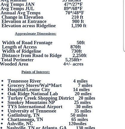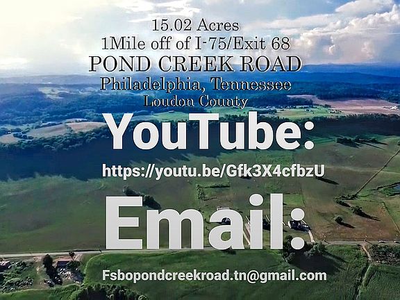 This beautiful property is for sale by owner. Private yet conveniently located just minutes outside Knoxville, TN. The rich soil is ideal for vineyards, gardens or pasture. Panoramic building site(s) await for your dream home. Scope of this countryside can be viewed in the video. NO REALTORS PLEASE. Owner is not interested in listing with any agency. Email: fsbopondcreekroad.tn@gmail.com YouTube link for panoramic video footage and additional information: https://youtu.be/Gfk3X4cfbzU Climate & Elevation (Feet Above Sea Level): Avg# Sunny Days=210 days. Avg Rainfall=55 inches. Avg Temps JAN=47*/27*F. Avg Temps JUL=89*/68*F. Annual Avg Temps=70*/48*F. Rise in Elevation=210ft. Elevation at Entrance 980 ft. Elevation across Ridgeline 1,190ft. Approximate Dimensions: Width of Road Frontage 50ft. Length of Access 870ft. Width of Ridgeline 730ft. Distance from Road to Ridge 2,250ft. Total Perimeter 5,250ft+. Wooded Area 4+/- acres. Points of Interest: Tennessee River 4 miles. Grocery Stores/Wal*Mart 7 miles. Hospital/Lenior City 14 miles. Oak Ridge National Lab 20 miles. Turkey Creek Shopping District 20 miles. Smokey Mountains NP 25 miles. TYS International Airport 30 miles. University of Tennessee 35 miles. Gatlinburg, TN 50 miles. Chattanooga, TN 65 miles. Ashville, NC 120miles. Nashville, TN or Atlanta, GA 130 miles. Birmingham, AL 200 miles. Columbus, OH 300 miles. Hilton Head Island, SC 330 miles. Destin, FL 390 miles. Chicago, IL 450 miles. Washington, DC 480 miles. New York City 675 miles. Miami, FL 730 miles. Boston, MA 860 miles.